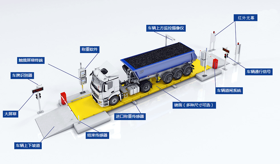 車輛通過道閘壓地感——紅綠燈變紅——觸發(fā)信號抓拍車牌號碼——道閘開閘通行——紅外感應車身全部上磅——第一次稱重——保存第一次稱重重量——語音播放第一次稱重重量——道閘開啟下磅——紅綠燈變綠——車輛裝貨或卸貨后——壓地感(車輛檢測器)觸發(fā)信號——紅綠燈變紅——識別車牌號——道閘開啟——紅外感應車身全部上磅——第二次稱重——保存第二次稱重重量——語音播放第二次重量或者是顯示屏顯示——車輛離開下地磅——等待車輛上磅。